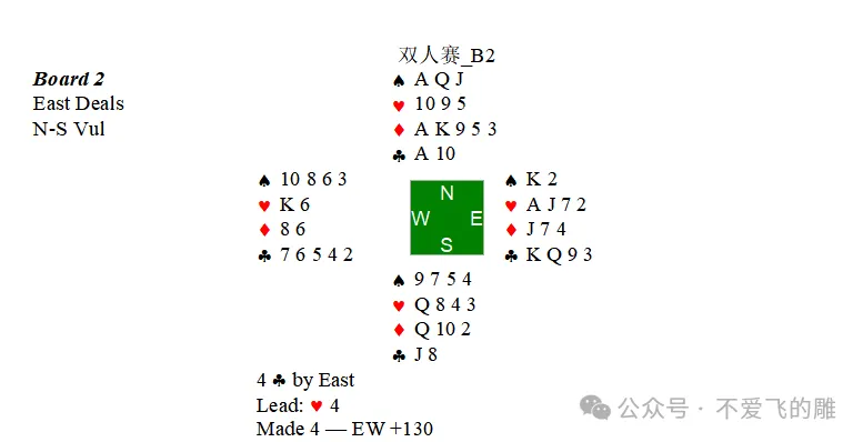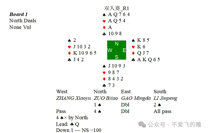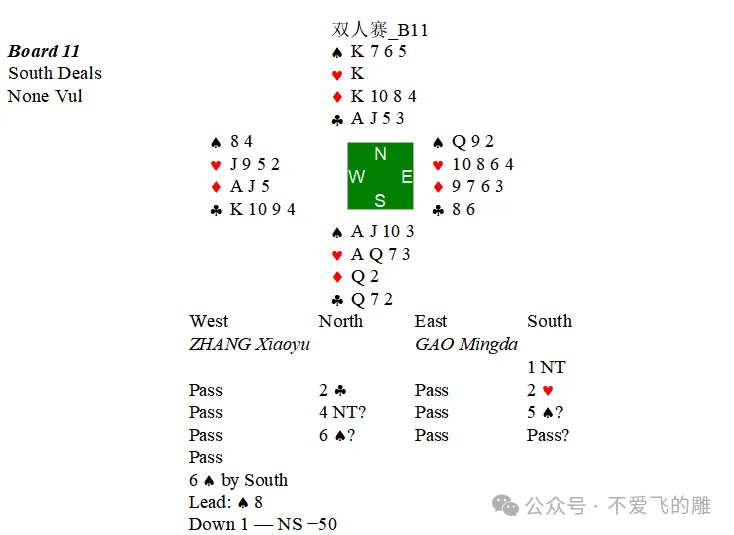 虽然这是双人赛,NT定约得分一般比♣定约好,但是这个牌看起来有将特征也算比较明显,因此还是选择加倍出♣。敌人叫上4♠后当然加倍。最终定约宕1,得了一个平均分。