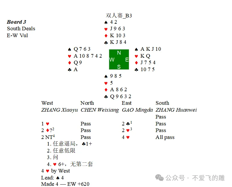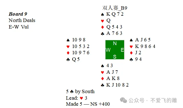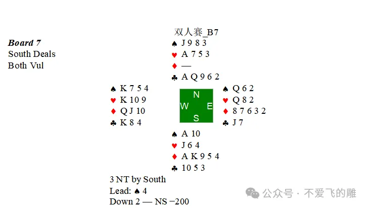 ,庄家手中用♦7将吃,我的♦Q吃到了一墩。最终定约宕3。这是本次双人赛我们的第三个顶分。
