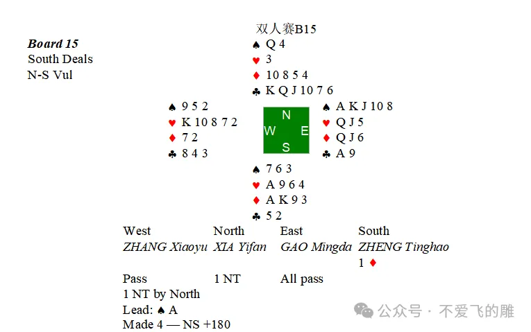 然而防守的过程充满了灾难。我们的约定是强K首攻,而在我攻出♠A后同伴给了态度信号——♠9,认为这是张数信号的我自然希望找到同伴的进手帮助穿梭庄家的♠Q。最后在混乱的垫牌下我希望同伴有♦T而放弃了♦止张。定约的最终结果是1NT+4。唯一值得庆幸的一点是这副牌的比赛分竟然不是0%。