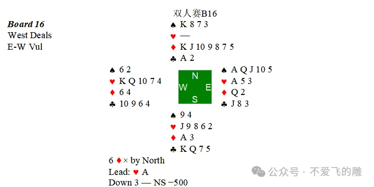 具体的进程叫牌进程和打牌过程我也不是很确定了,总之我和同伴各显示了♠和♥,北家突然跳进6♦。对于双人赛,我拿着两个A没怎么犹豫就加倍了。庄家最终输了两个♠和两个将牌。庄家将吃首攻后兑现♣AKQ并垫去手中一个♠,并飞♠A不中。注意到同伴的张数信号,我回出♠,庄家用桌上♦3将吃,同伴用♦4超吃后回出