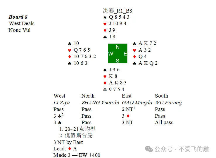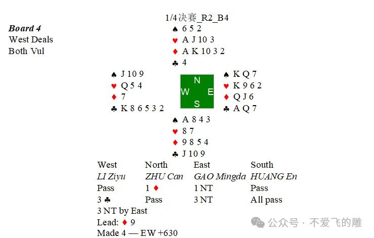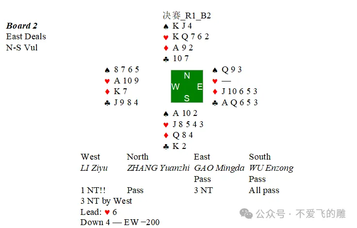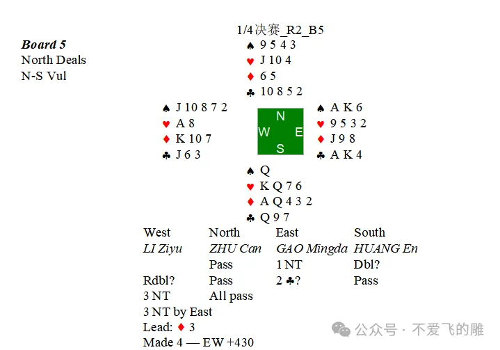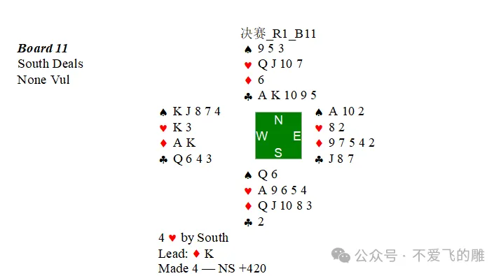 (这一节比赛结束后,结分时北家说这副3NT实在可惜,他已经做了能做的所有事情,但是庄家打对还是没法防宕。当我刚想说最后回♣会打宕定约的时候裁判过来制止了我们的聊天。)