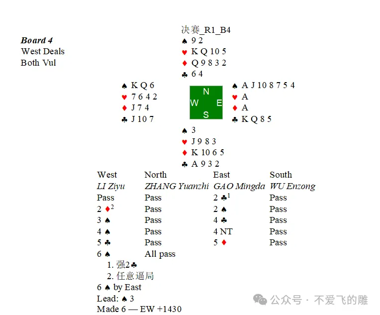 编者注:西家当时准备打庄家♠Ax♥A9xxx♦QJx♣Jxx,回♣庄家♣A吃进飞♥,然后出♣,庄家还是继续出♣犯错。南家的开叫比较像有♠A,同伴又给的♦花选,在拿着♠Qxx♥xx♦T987542♣8,在北家直接♣4配显后也没有合适的行动,符合叫牌进程,这时候真的需要信号的帮助了。