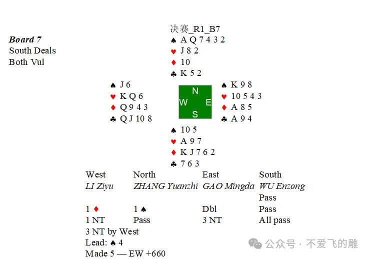 同伴首攻♦K,桌上单张,显而易见我应当给出花选信号指导同伴接下来的进攻方向。然而面对同伴的♦K,我下意识的认为庄家有♦A而给出了张数信号——♦2。庄家没有吃进这一墩的时候我发现大事不妙,但已经晚了。这种局势更像是推理和直觉的结合,即这里应当能推理出应该给出花选,因为即使庄家♦A吃进,在清将时也很可能输给同伴的♥A或K,同伴还是需要我的信号。打的多了,首攻大牌到桌上单张的时候第三家给花选也就成为了一种直觉。在我个人整场比赛的最后一副有大输赢的牌竟然犯了如此低级的错误,不得不说是参加本次比赛的一个很大的遗憾。
