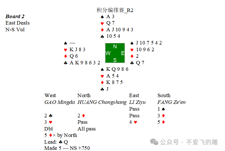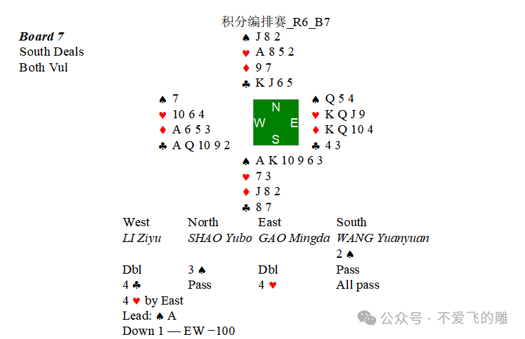 按照事先的安排,我在积分编排赛的第一轮休息,而第二轮的第一副牌同伴第一口就争叫4♠并成为最终定约,因此这实际上是我本次比赛参与的第一副牌,就拿到了7420的畸形牌。