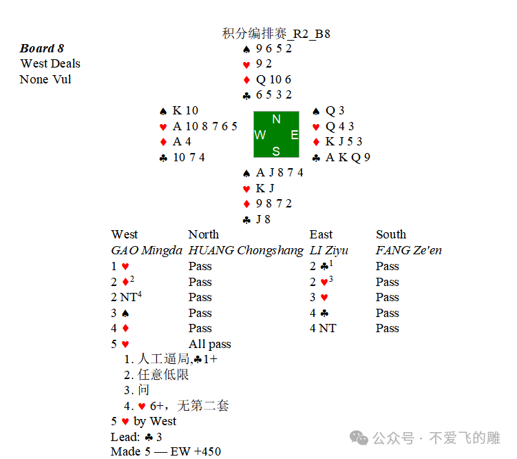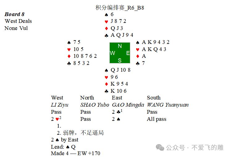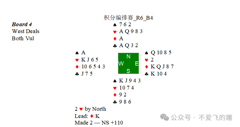 又是一副作了较为积极的竞叫的牌。单无局将4540处理成双套红花争叫,虽然在♠上有两张大牌,并不标准,但是也给敌方带来了较大的麻烦,最终南北两家都没有在3阶再叫♣套,同伴还摸走了这个2♦。另一桌的定约是S:3♣+1,双赢进账6个imp。