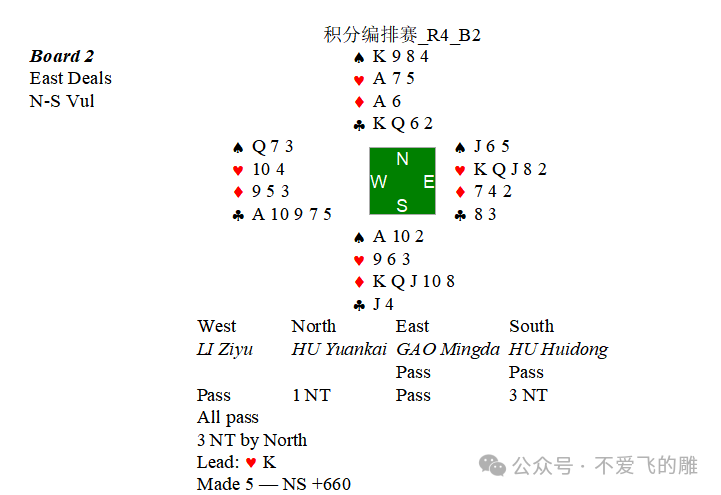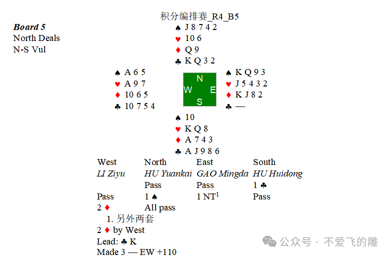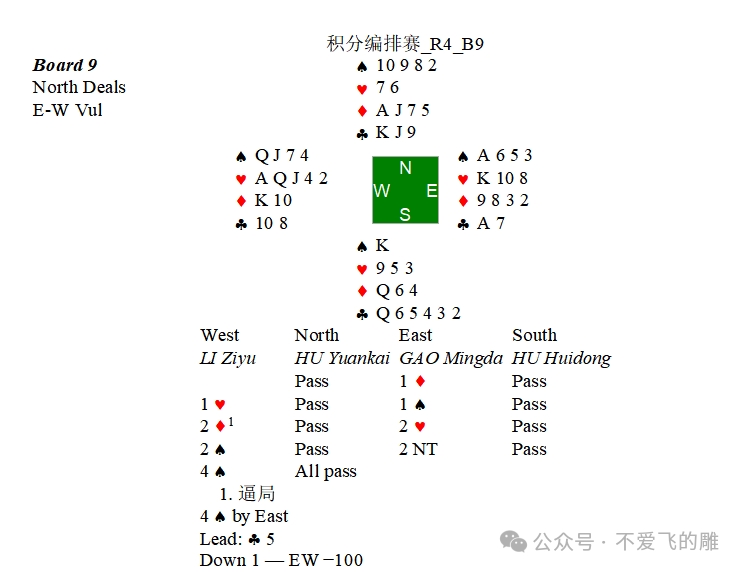 这副牌应该是我这次比赛第一个比较大的失误。庄家最后明显剩余2张将牌和3张♣,我剩3张♣和两张♦大牌。庄家手里起♣Q,由于前面没有太关心庄家的桥路问题,我下意识认为如果庄家有♣A,一定会从明手起♣,因此放小希望同伴进手穿梭庄家的♣J,庄家的♣Q竟然吃到一墩,定约正成。实际上若庄家是♣QJx,我♣K吃进后只要简单兑现♦,庄家最终还是要从手中的♣Jx向外出牌。从前期出牌也很容易推理出这里同伴的♣不会是单A。另一桌同伴叫进了4♥,这副看起来不大的牌双输了9个imp。