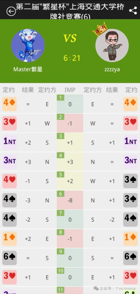 暑假期间,由上海交通大学桥牌社社员牵头组织的内部线上比赛——第二届“繁星杯”火热展开,本届繁星杯共有22名社员参加。赛事共持续10天。陈毕加同学获得冠军,张煦旸、张艺骜同学分获亚军、季军。